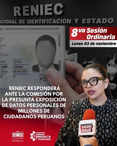 La Comisión de Ciencia, Innovación y Tecnología del Congreso de la República, presidida por la congresista Ariana Orué, citó a la Jefa Nacional del RENIEC, Carmen Milagros Velarde Koechlin, a fin de informar sobre la presunta exposición de datos personales de millones de ciudadanos.